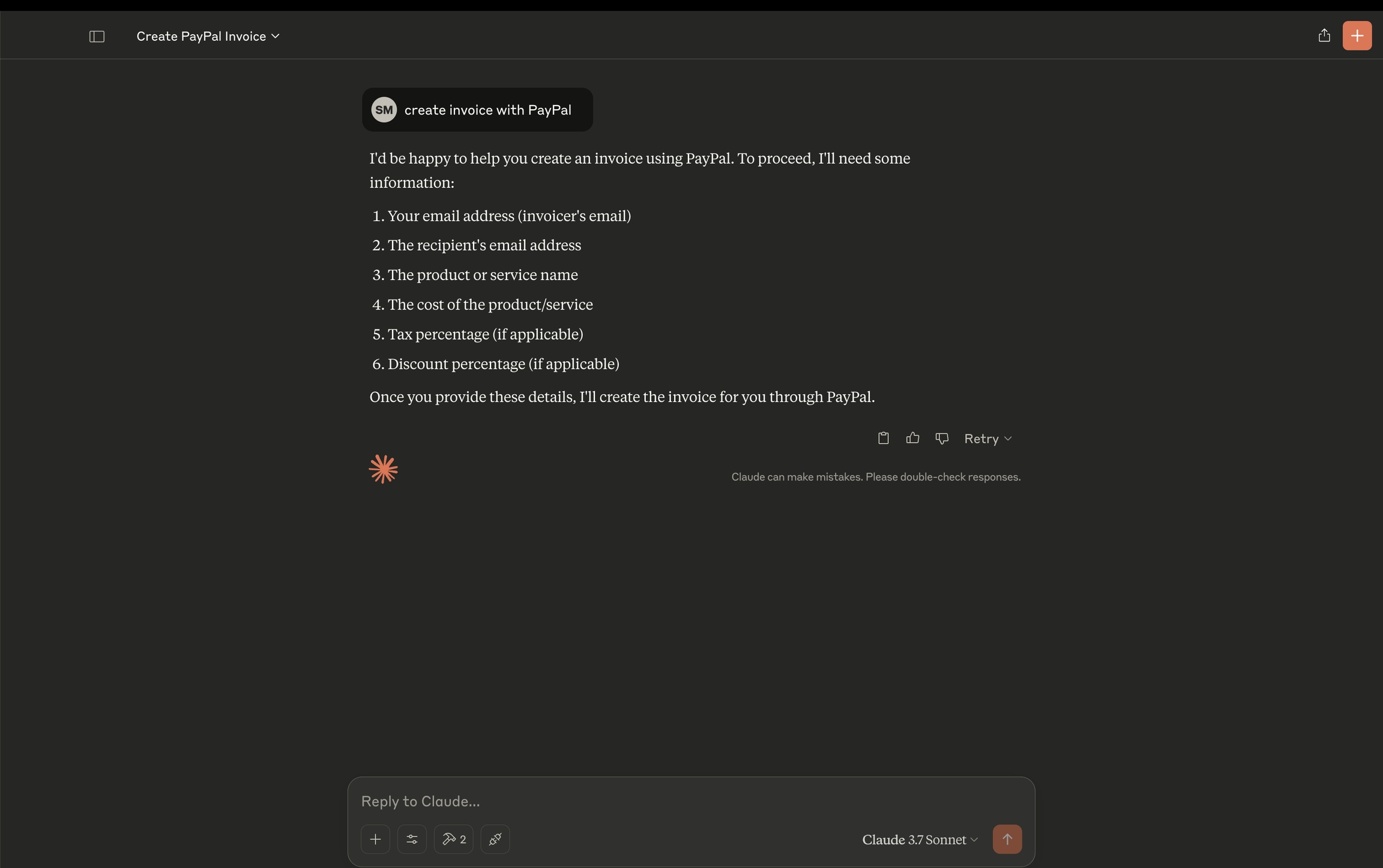 For example, a user asks the MCP client to create an invoice with PayPal.